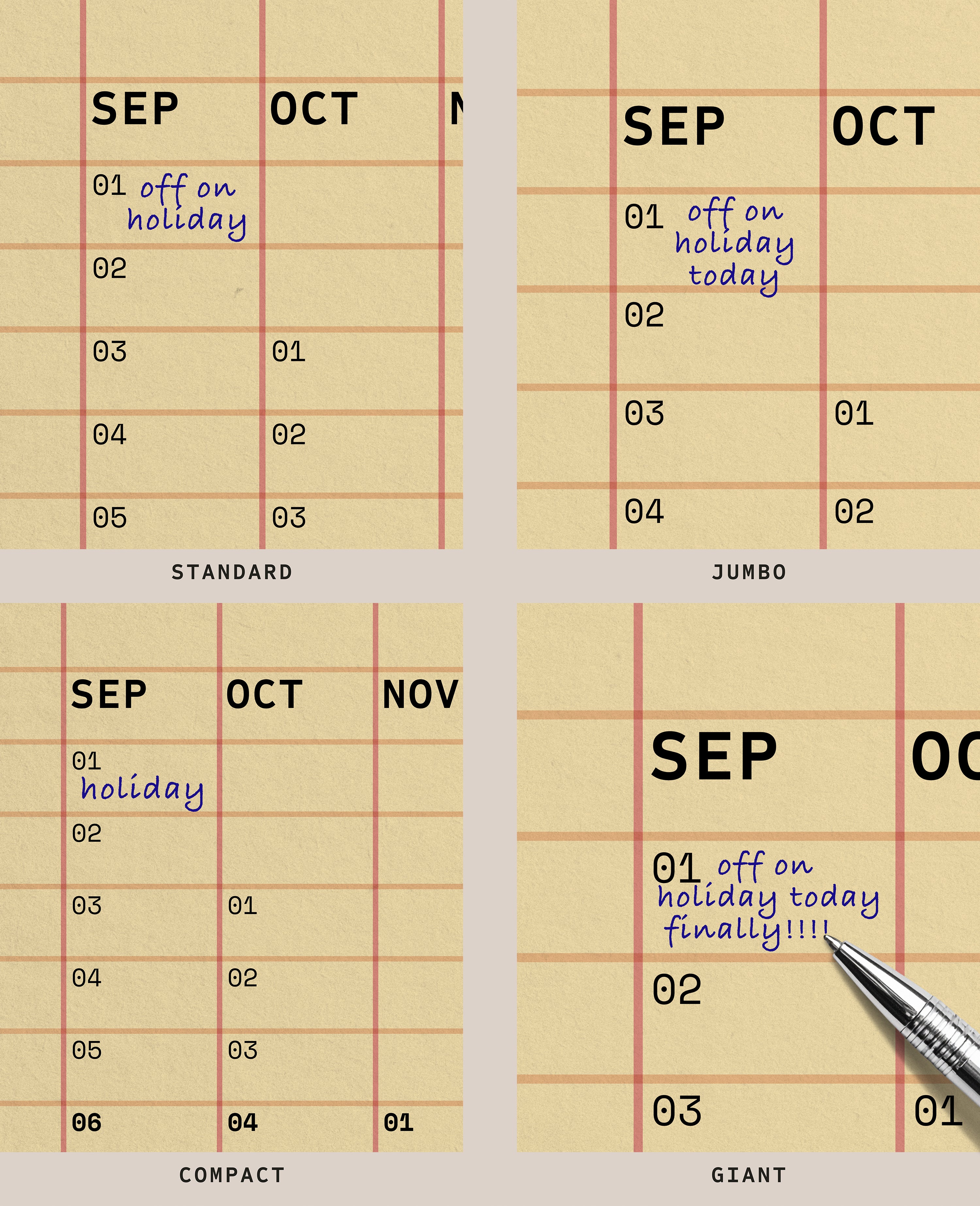 Squared is based on a familiar organisation of a gridded notebook. Vertical months and horizontal weeks add clear structure to simplify scheduling. The planner's thoughtful typography prioritises clarity and legibility, ensuring that dates, appointments, and notes remain accessible.